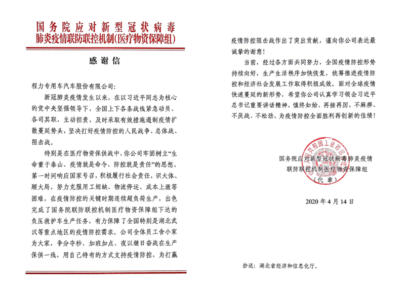 特別是在醫療物資保供戰中,你公司牢固樹立“生命重于秦山、疫情就是命令、防控就是責任”的思想,第一時間響應國家號召,積極履行社會責任,識大體、顧大局,努力克服用工短缺、物流停運、成本上漲等困難,在疫情防控的關鍵時期連續超負荷生產,出色完成了國務院聯防聯控機制醫療物資保障組下達的負壓救護車生產任務,有力保障了全國特別是湖北武漢等重點地區的疫情防控需求。公司全體員工舍小家為大家,爭分奪秒、加班加點、夜以繼日奮戰在生產保供一線,用自己特有的方式支持疫情防控,為打贏疫情防控阻擊戰作出了突出貢獻,謹向你公司表達最誠摯的謝意!