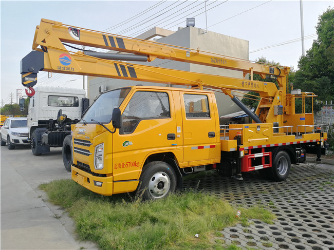 江鈴17.5米折臂高空作業(yè)車采用三節(jié)折疊臂結構,轉臺可操作,也可工作斗操作,可360度回轉,四液壓支腿,工作斗最大承重200公斤,不銹鋼圍板、花紋防滑走臺板。