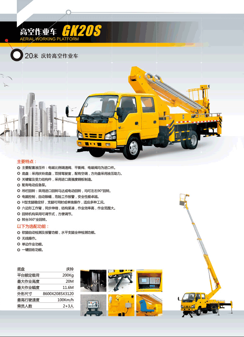 五十鈴高空作業(yè)車(chē)專(zhuān)用性能:五十鈴高空作業(yè)車(chē)設(shè)備結(jié)構(gòu)簡(jiǎn)單,堅(jiān)固耐用,操作方便可靠。獨(dú)特的全回轉(zhuǎn)三折臂液壓操控系統(tǒng)設(shè)計(jì)使工作人員操作更平穩(wěn),能更安全的將工作人員送到18米的高空作業(yè),進(jìn)行維修、安裝、清洗、攝影、造船、化工、電力、剪枝、更換路燈及其他工程搶修。