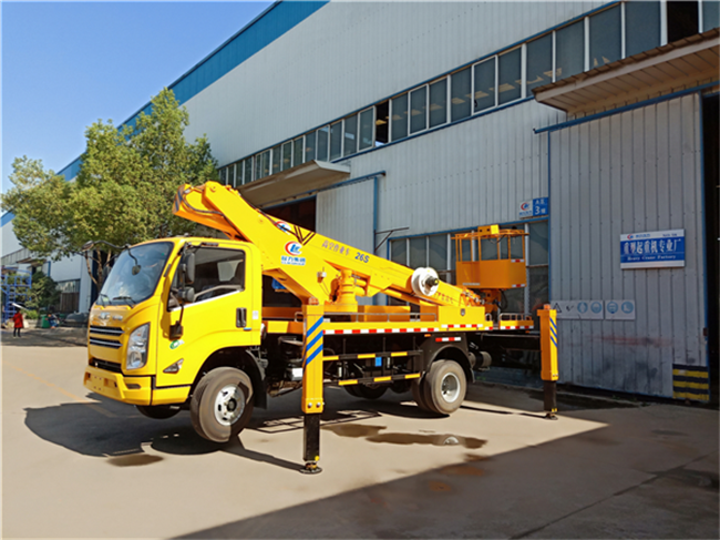 上裝配置:液壓360度全回轉,三節折疊臂,單液壓舉升缸,帶雙向平衡閥,電控操作舉升臂,1噸可伸縮式吊鉤,四支液壓油缸可調式支腿帶雙向液壓鎖(支腿操作為手動操作,可單獨控制)。左右警示燈,黃色車身,全車貼反光標識,雙人穩定作業斗,帶后防護,倆側防護,配一個移動工具箱。