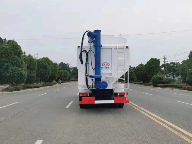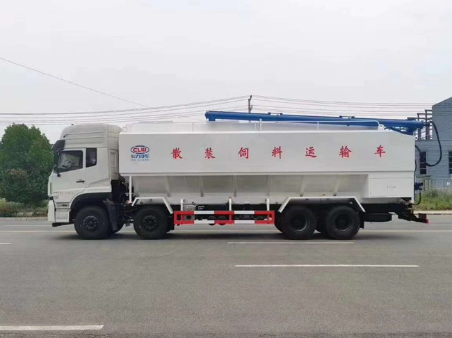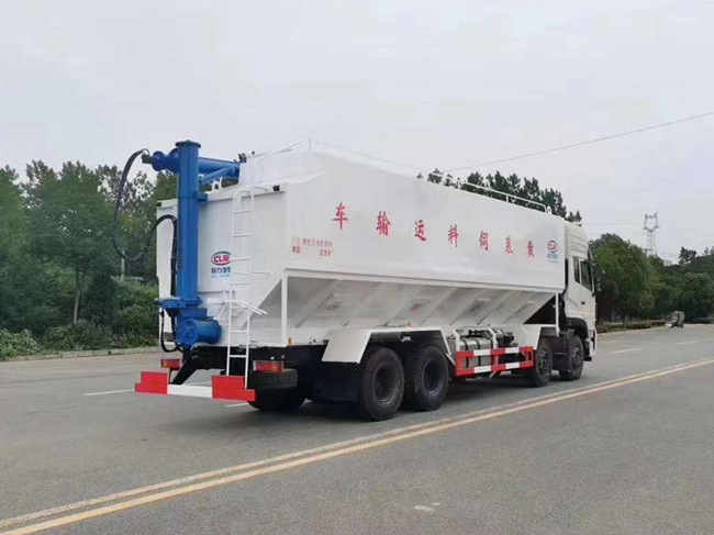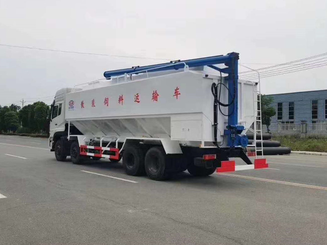 散裝飼料車的飼料罐架設(shè)在卡車的底盤上,罐頂開有進(jìn)料口.頂部的一根螺旋輸送卸料管(俗稱卸料絞龍)則可自由回轉(zhuǎn)和抬升,抬升的仰角可達(dá)60度。運(yùn)輸時(shí),頂部的螺旋管平臥在罐頂;卸料時(shí)則抬起,使管端的出料口與畜禽飼養(yǎng)場貯料罐頂部的進(jìn)料門相接,駕駛室內(nèi)裝有操縱裝置(操縱裝置也可裝置在罐體尾部),卸料時(shí)通過車底的動力輸出軸和減速器來驅(qū)動螺旋,以完成卸料。目前國內(nèi)主要推出3T、5T、8T、11T、15T和22T等多個噸位車型。