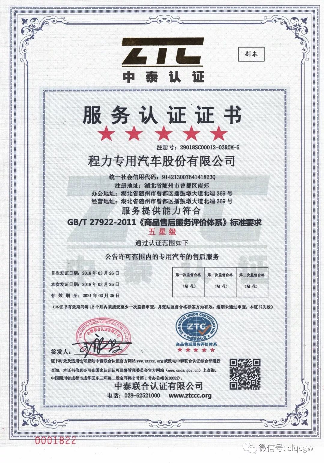 熱烈祝賀程力專用汽車股份有限公司榮獲售后服務五星級認證