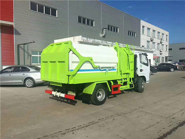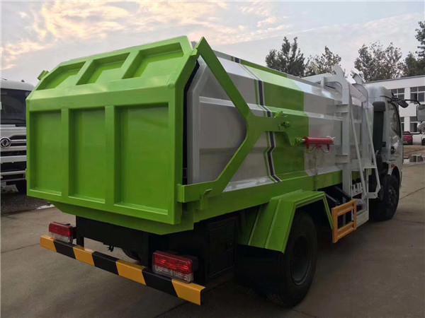 后裝壓縮垃圾車裝載垃圾時由提升機構將垃圾裝入后料斗。刮板和滑板配合將后斗內的垃圾壓入壓縮箱內,箱內的壓縮推板雙向壓縮,壓縮效率高。整個操作過程由PLC可編程電控,可一鍵循環,操作簡單。但是結構相對側裝壓縮垃圾車更復雜,成本也更高。
