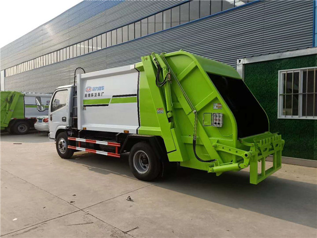 上裝配置:新款無筋條箱體,平面圓弧美觀大方 ,有效壓縮容積為5立方 ,尾部帶翻轉上料機構,電控手控雙操作器,駕駛室與尾部雙控制箱,尾部帶3cm厚橡膠密封壓條,帶污水收集箱。尾部填裝機構有5種樣式可選:擺臂式翻轉架、掛桶式翻轉機構、大落地斗、三角斗、無翻轉機構。
