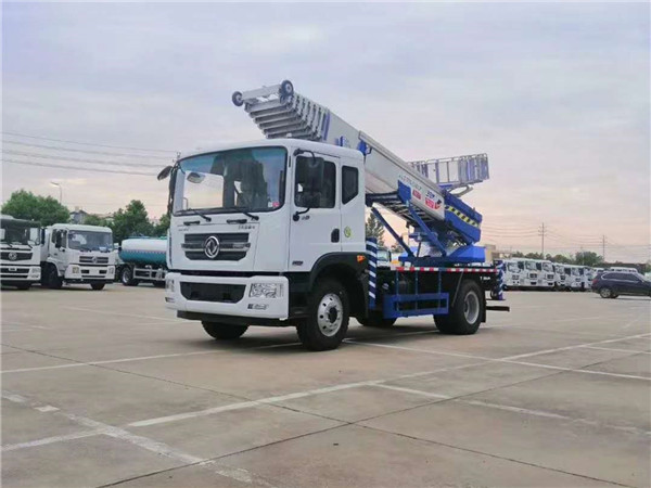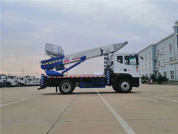 進口38米云梯車配置,底盤采用東風D9排半,帶助力,空調,倒車影像,進口液壓支腿,進口鋁合金貨斗,進口液壓散熱器,100米無線遙控(德國系統),遙控功能:1控制料斗上下、2:云梯角度遙控、3:云梯旋轉遙控、4:云梯伸縮遙控、可以加速、減速,梯臂為韓國最新技術梯臂,梯臂采用特種鋁合金,是分離模式,末端帶有滑輪。
