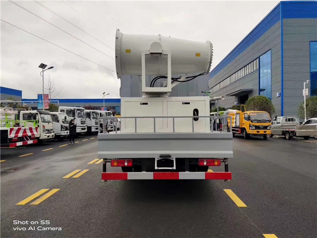 該車帶前沖、后灑、后工作平臺(tái)帶高壓水炮(炮可360度旋轉(zhuǎn),可連續(xù)調(diào)節(jié),噴出柱狀、雨?duì)睢腱F狀水流,柱狀射程28米)、帶大功率環(huán)保除塵風(fēng)送式噴霧機(jī)(噴霧距離可達(dá)40-100米不等,根據(jù)客戶要求選擇配備,噴霧機(jī)具體性能參數(shù)歡迎來電咨詢)。前置電子自動(dòng)炮,可上下、左右旋轉(zhuǎn),駕駛室控制。前置電子炮,方便駕駛員操作,節(jié)省人力。